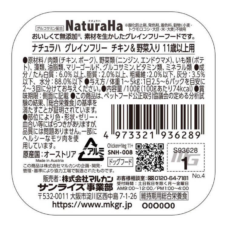 【12個セット】 マルカン サンライズ ナチュラハ グレインフリー チキン&野菜入り 11歳以上用100g【ポイント10倍】 【送料無料】