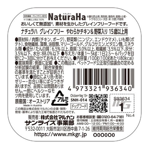【36個セット】 マルカン サンライズ ナチュラハ グレインフリー やわらかチキン&野菜入 15歳以上用 100g【ポイント10倍】 【送料無料】