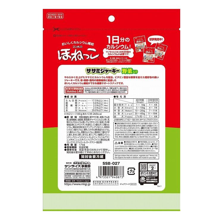 人の約20倍のカルシウムが必要な愛犬のために作られた、やわらかおいしい野菜入りのササミジャーキーです。