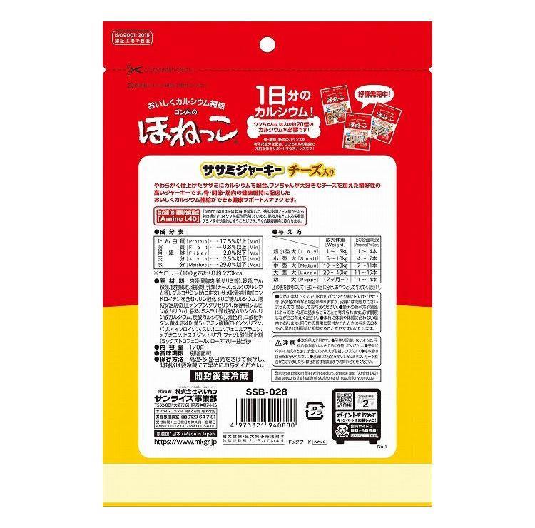 人の約20倍のカルシウムが必要な愛犬のために作られた、やわらかおいしいチーズ入りのササミジャーキーです。