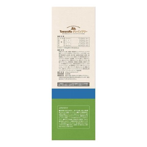 肉類(チキン等)、糖類、野菜類(エンドウマメ、エンドウ蛋白、ニンジン、かぼちゃ、ブロッコリー、トマト等)、いも類(馬鈴薯でん粉等)、魚介類、油脂類(亜麻仁油等)、食物繊維、グルコサミン(カニ由来)、サメ軟骨抽出物(コンドロイチンを含む)、乳酸菌、ミネラル類(リン酸カルシウム、塩化カリウム、炭酸カルシウム、塩化ナトリウム、硫酸マグネシウム、炭酸亜鉛、硫酸鉄、硫酸銅、炭酸マンガン、ヨウ素酸カルシウム )、増粘安定剤(グリセリン、カゼインナトリウム)、pH調整剤、ビタミン類(コリン、C、E、A、B13、ニコチン酸、パントテン酸、B6、B1、B2、葉酸、D)、アミノ酸(DL-メチオニン、トリプトファン)、酸化防止剤(ミックストコフェロール、ハーブ抽出物)
