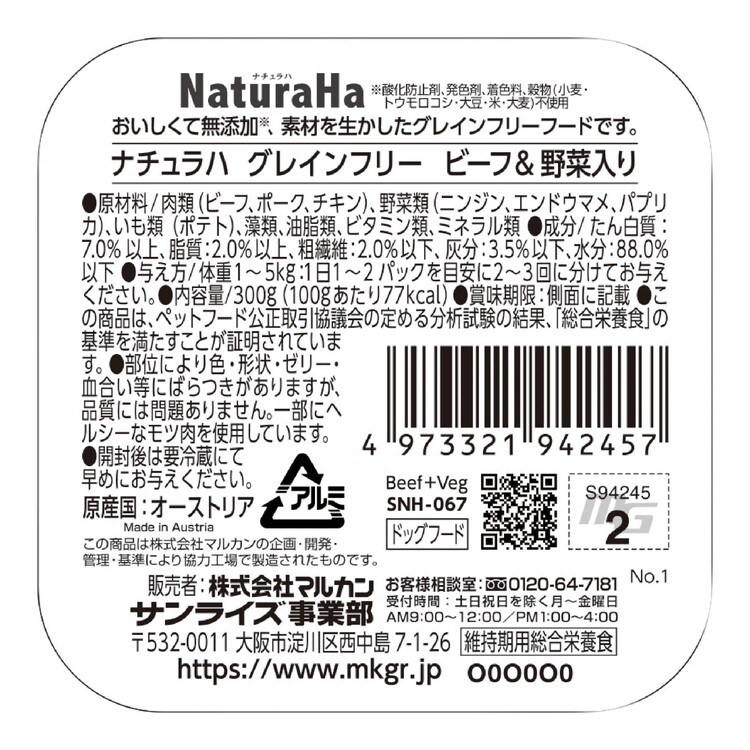 【12個セット】 マルカン サンライズ ナチュラハ グレインフリー ビーフ&野菜入り 300g【ポイント10倍】 【送料無料】