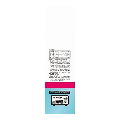 トウモロコシ、グルテンミール、チキンミール、小麦粉、動物性油脂、フィッシュミール、ビーフミール、ポークミール、フィッシュエキス、食物繊維、植物性油脂、酵母、まぐろ、かつお削りぶしパウダー、ローストアマニ、乳酸菌、アガリクス、セサミン、クランベリー、ミネラル類(Na、Cl、Ca、P、K、Zn、Fe、Cu、Co、Mn、I)、アミノ酸類(シスチン、メチオニン、タウリン)、ビタミン類(A、B1、B2、B6、B12、C、D3、E、K3、コリン、ニコチン酸、パントテン酸、ビオチン、葉酸)、調味料、酸化防止剤(ミックストコフェロール、ハーブ抽出物)
