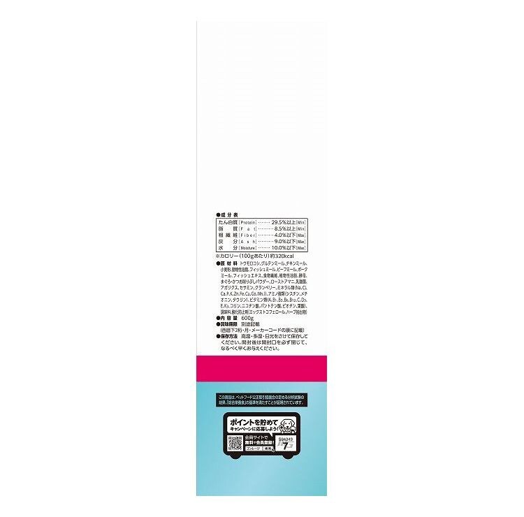 トウモロコシ、グルテンミール、チキンミール、小麦粉、動物性油脂、フィッシュミール、ビーフミール、ポークミール、フィッシュエキス、食物繊維、植物性油脂、酵母、まぐろ、かつお削りぶしパウダー、ローストアマニ、乳酸菌、アガリクス、セサミン、クランベリー、ミネラル類(Na、Cl、Ca、P、K、Zn、Fe、Cu、Co、Mn、I)、アミノ酸類(シスチン、メチオニン、タウリン)、ビタミン類(A、B1、B2、B6、B12、C、D3、E、K3、コリン、ニコチン酸、パントテン酸、ビオチン、葉酸)、調味料、酸化防止剤(ミックストコフェロール、ハーブ抽出物)