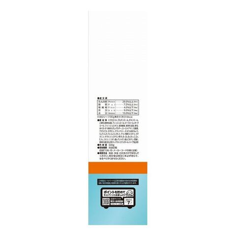 トウモロコシ、グルテンミール、チキンミール、小麦粉、動物性油脂、フィッシュミール、ビーフミール、ポークミール、フィッシュエキス、食物繊維、植物性油脂、酵母、まぐろ・かつお削りぶしパウダー、ローストアマニ、乳酸菌、アガリクス、セサミン、クランベリー、ミネラル類(Na、Cl、Ca、P、K、Zn、Fe、Cu、Co、Mn、I)、アミノ酸類(シスチン、メチオニン、タウリン)、ビタミン類(A、B1、B2、B6、B12、C、D3、E、K3、コリン、ニコチン酸、パントテン酸、ビオチン、葉酸)、調味料、酸化防止剤(ミックストコフェロール、ハーブ抽出物)