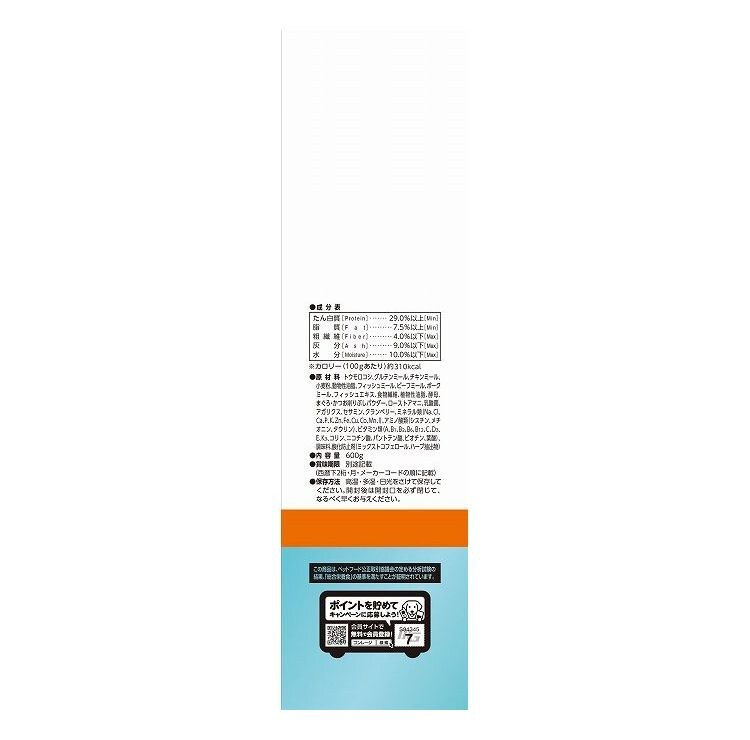 トウモロコシ、グルテンミール、チキンミール、小麦粉、動物性油脂、フィッシュミール、ビーフミール、ポークミール、フィッシュエキス、食物繊維、植物性油脂、酵母、まぐろ・かつお削りぶしパウダー、ローストアマニ、乳酸菌、アガリクス、セサミン、クランベリー、ミネラル類(Na、Cl、Ca、P、K、Zn、Fe、Cu、Co、Mn、I)、アミノ酸類(シスチン、メチオニン、タウリン)、ビタミン類(A、B1、B2、B6、B12、C、D3、E、K3、コリン、ニコチン酸、パントテン酸、ビオチン、葉酸)、調味料、酸化防止剤(ミックストコフェロール、ハーブ抽出物)