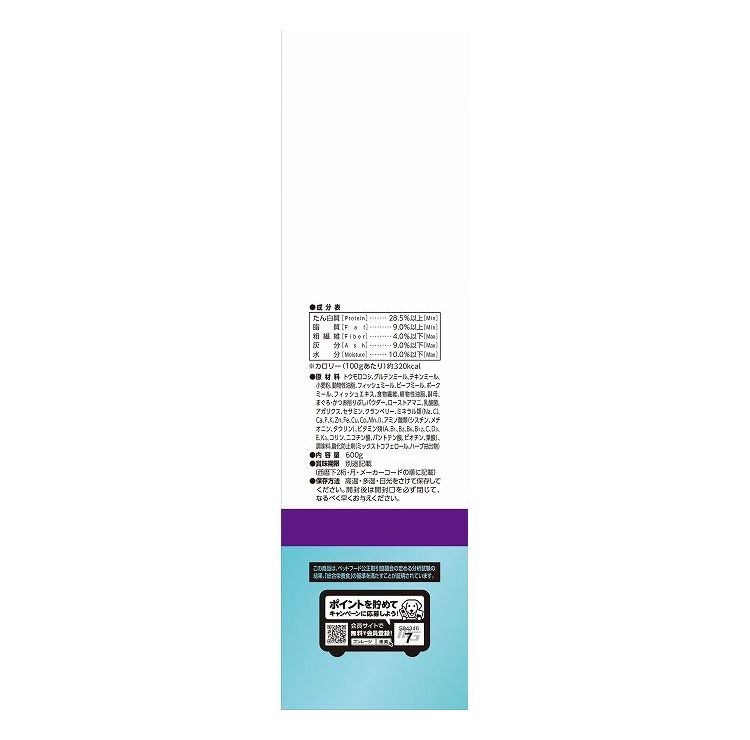 トウモロコシ、グルテンミール、チキンミール、小麦粉、動物性油脂、フィッシュミール、ビーフミール、ポークミール、フィッシュエキス、食物繊維、植物性油脂、酵母、まぐろ・かつお削りぶしパウダー、ローストアマニ、乳酸菌、アガリクス、セサミン、クランベリー、ミネラル類(Na、Cl、Ca、P、K、Zn、Fe、Cu、Co、Mn、I)、アミノ酸類(シスチン、メチオニン、タウリン)、ビタミン類(A、B1、B2、B6、B12、C、D3、E、K3、コリン、ニコチン酸、パントテン酸、ビオチン、葉酸)、調味料、酸化防止剤(ミックストコフェロール、ハーブ抽出物)