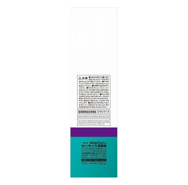 室内で過ごす15歳以上のシニア猫の健康に配慮し低脂肪に調整※1。下部尿路の健康維持のためマグネシウム、リン、カルシウムを調整し※2、食物繊維の配合により体内の毛玉を無理なく排泄します。食物アレルギーに配慮してアレルゲンになりにくいといわれるフィッシュを使用し、健康を維持する事で免疫をサポートするアガリクスや抗酸化成分があるセサミンを強化※3しています。(※1:室内成猫用比95%、※2:マグネシウム約0.1%、リン約1.0%、カルシウム約1.1%、※3:室内成猫用比150%) 腎臓の健康維持に配慮し、ナトリウムの含有量を調整(標準0.37%)