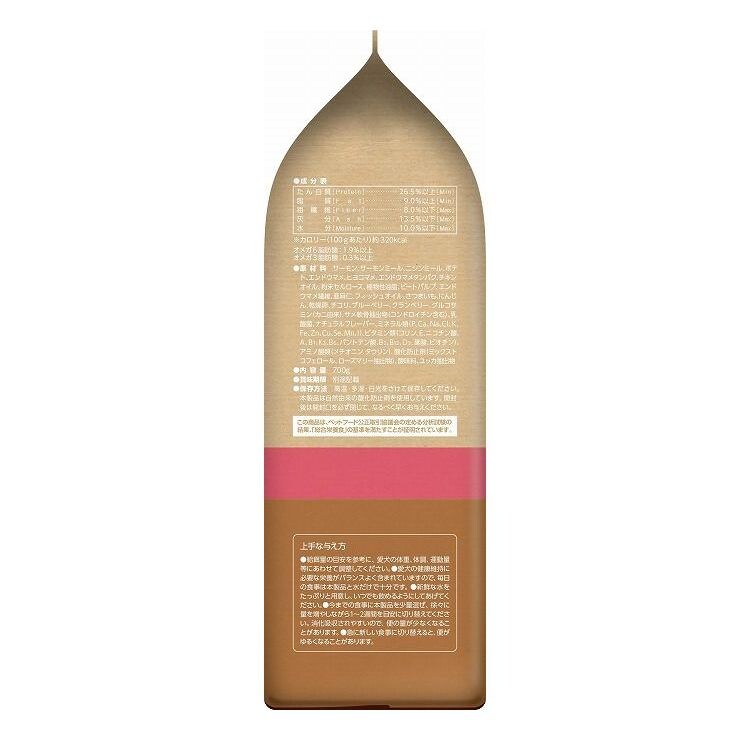 サーモン、サーモンミール、ニシンミール、ポテト、エンドウマメ、ヒヨコマメ、エンドウマメタンパク、チキンオイル、粉末セルロース、植物性油脂、ビートパルプ、エンドウマメ繊維、亜麻仁、フィッシュオイル、さつまいも、にんじん、乾燥卵、チコリ、ブルーベリー、クランベリー、グルコサミン(カニ由来)、サメ軟骨抽出物(コンドロイチン含む)、乳酸菌、ナチュラルフレーバー、ミネラル類(P、Ca、Na、Cl、K、Fe、Zn、Cu、Se、Mn、I)、ビタミン類(コリン、E、ニコチン酸、A、B1、K3、B6、パントテン酸、B2、B12、D3、葉酸、ビオチン)、アミノ酸類(メチオニン、タウリン)、酸化防止剤(ミックストコフェロール、ローズマリー抽出物)、酸味料、ユッカ抽出物
