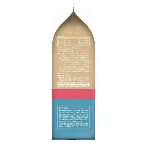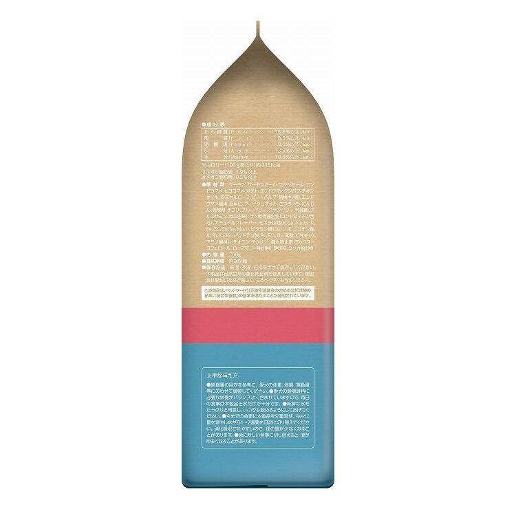 サーモン、サーモンミール、ニシンミール、エンドウマメ、ヒヨコマメ、ポテト、エンドウマメタンパク、チキンオイル、粉末セルロース、ビートパルプ、植物性油脂、エンドウマメ繊維、亜麻仁、フィッシュオイル、さつまいも、にんじん、乾燥卵、チコリ、ブルーベリー、クランベリー、乳酸菌、グルコサミン(カニ由来)、サメ軟骨抽出物(コンドロイチン含む)、ナチュラルフレーバー、ミネラル類(P、Ca、Na、Cl、K、Fe、Zn、Cu、Se、Mn、I)、ビタミン類(コリン、E、ニコチン酸、A、B1、K3、B6、パントテン酸、B2、B12、D3、葉酸、ビオチン)、アミノ酸類(メチオニン、タウリン)、酸化防止剤(ミックストコフェロール、ローズマリー抽出物)、酸味料、ユッカ抽出物
