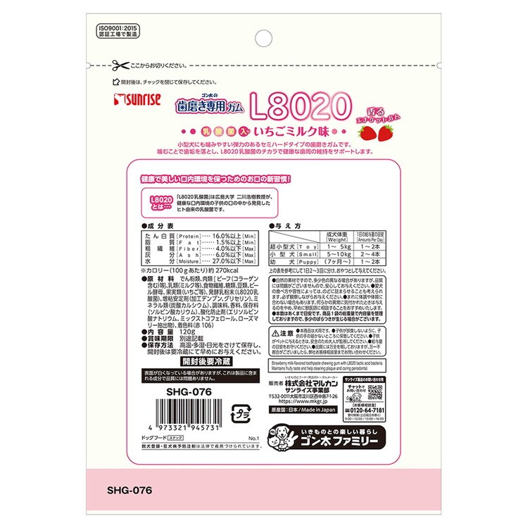 ・小型犬にも噛みやすい弾力のあるセミハードタイプの歯磨きガムです。噛むことで歯垢を落とし、L8020乳酸菌のチカラで健康な歯周の維持をサポートします。
