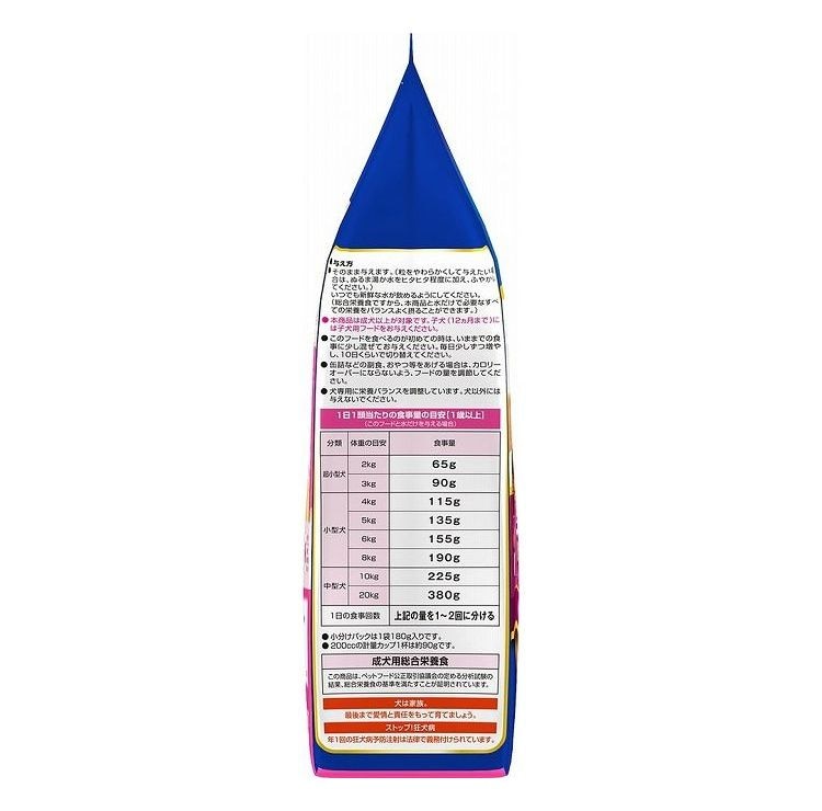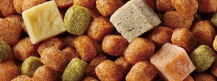 穀類(トウモロコシ、小麦粉、脱脂米糠、コーングルテンフィード、小麦タンパク)、肉類(チキンミール、チキン、鶏ササミ、牛肉粉、豚肉粉、チキンレバーパウダー)、脱脂大豆、油脂類(動物性油脂、植物性油脂(オメガ-6脂肪酸含む))、チーズ、小魚粉末、コーンスターチ、ビール酵母、糖類(ショ糖、オリゴ糖)、食塩、セレン酵母、野菜類(キャベツ、大麦若葉、カボチャ、トマト、ニンジン、ブロッコリー、ホウレンソウ、モロヘイヤ)、カゼインホスホペプチド、プロピレングリコール、ミネラル類(カルシウム、リン、ナトリウム、クロライド、鉄、銅、マンガン、亜鉛、ヨウ素、コバルト)、pH調整剤、保存料(ソルビン酸カリウム、デヒドロ酢酸ナトリウム)、グリセリン、膨張剤、ビタミン類(A、B2、B6、B12、D、E、パントテン酸、コリン)、ソルビトール、着色料(二酸化チタン、食用赤色102号、食用赤色106号、食用黄色4号、食用黄色5号、食用青色1号)、メタリン酸ナトリウム、酸化防止剤(エリソルビン酸ナトリウム、ミックストコフェロール、ローズマリー抽出物)、増粘安定剤(グァーガム)、香料、グルコサミン、アミノ酸類(アルギニン、メチオニン)、コンドロイチン