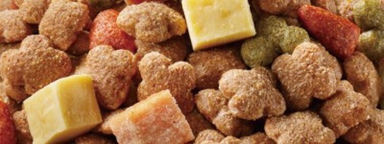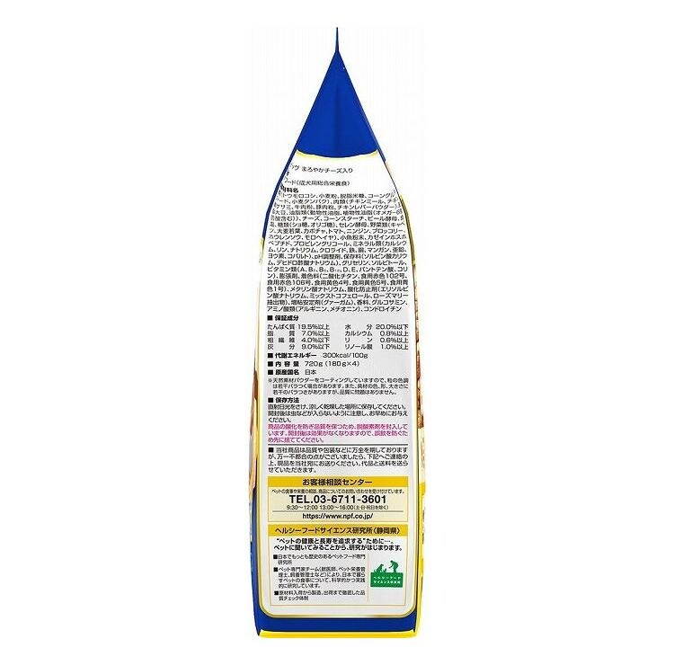穀類(トウモロコシ、小麦粉、脱脂米糠、コーングルテンフィード、小麦タンパク)、肉類(チキンミール、チキン、鶏ササミ、牛肉粉、豚肉粉、チキンレバーパウダー)、脱脂大豆、油脂類(動物性油脂、植物性油脂(オメガ-6脂肪酸含む))、チーズ、コーンスターチ、ビール酵母、食塩、糖類(ショ糖、オリゴ糖)、セレン酵母、野菜類(キャベツ、大麦若葉、カボチャ、トマト、ニンジン、ブロッコリー、ホウレンソウ、モロヘイヤ)、小魚粉末、カゼインホスホペプチド、プロピレングリコール、ミネラル類(カルシウム、リン、ナトリウム、クロライド、鉄、銅、マンガン、亜鉛、ヨウ素、コバルト)、pH調整剤、保存料(ソルビン酸カリウム、デヒドロ酢酸ナトリウム)、グリセリン、ソルビトール、ビタミン類(A、B2、B6、B12、D、E、パントテン酸、コリン)、膨張剤、着色料(二酸化チタン、食用赤色102号、食用赤色106号、食用黄色4号、食用黄色5号、食用青色1号)、メタリン酸ナトリウム、酸化防止剤(エリソルビン酸ナトリウム、ミックストコフェロール、ローズマリー抽出物)、増粘安定剤(グァーガム)、香料、グルコサミン、アミノ酸類(アルギニン、メチオニン)、コンドロイチン