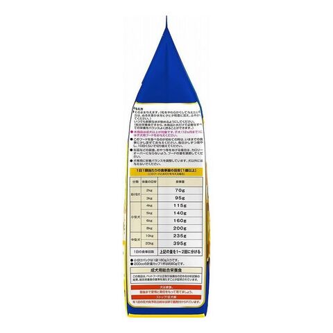 たんぱく質19.5%以上、脂質7.0%以上、粗繊維4.0%以下、灰分9.0%以下、水分20.0%以下、カルシウム0.8%以上、リン0.6%以上、リノール酸1.0%以上