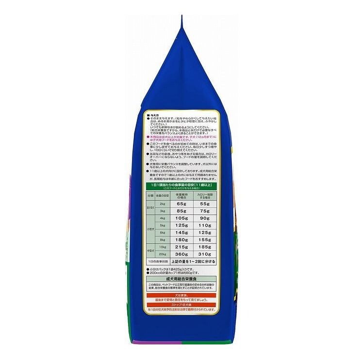 穀類(トウモロコシ、小麦粉、脱脂米糠、コーングルテンフィード、小麦タンパク)、肉類(チキンミール、チキン、鶏ササミ、牛肉粉、豚肉粉、チキンレバーパウダー)、脱脂大豆、油脂類(動物性油脂、植物性油脂(オメガ-6脂肪酸含む))、小魚粉末、糖類(ショ糖、オリゴ糖)、ビール酵母、食塩、セレン酵母、野菜類(キャベツ、大麦若葉、カボチャ、トマト、ニンジン、ブロッコリー、ホウレンソウ、モロヘイヤ)、コエンザイムQ10、カゼインホスホペプチド、プロピレングリコール、ミネラル類(カルシウム、リン、ナトリウム、クロライド、鉄、銅、マンガン、亜鉛、ヨウ素、コバルト)、pH調整剤、保存料(ソルビン酸カリウム、デヒドロ酢酸ナトリウム)、膨張剤、ソルビトール、ビタミン類(A、B2、B6、B12、D、E、パントテン酸、コリン)、着色料(二酸化チタン、食用赤色102号、食用赤色106号、食用黄色4号、食用黄色5号、食用青色1号)、酸化防止剤(エリソルビン酸ナトリウム、ミックストコフェロール、ローズマリー抽出物)、グルコサミン、アミノ酸類(アルギニン、メチオニン)、コンドロイチン