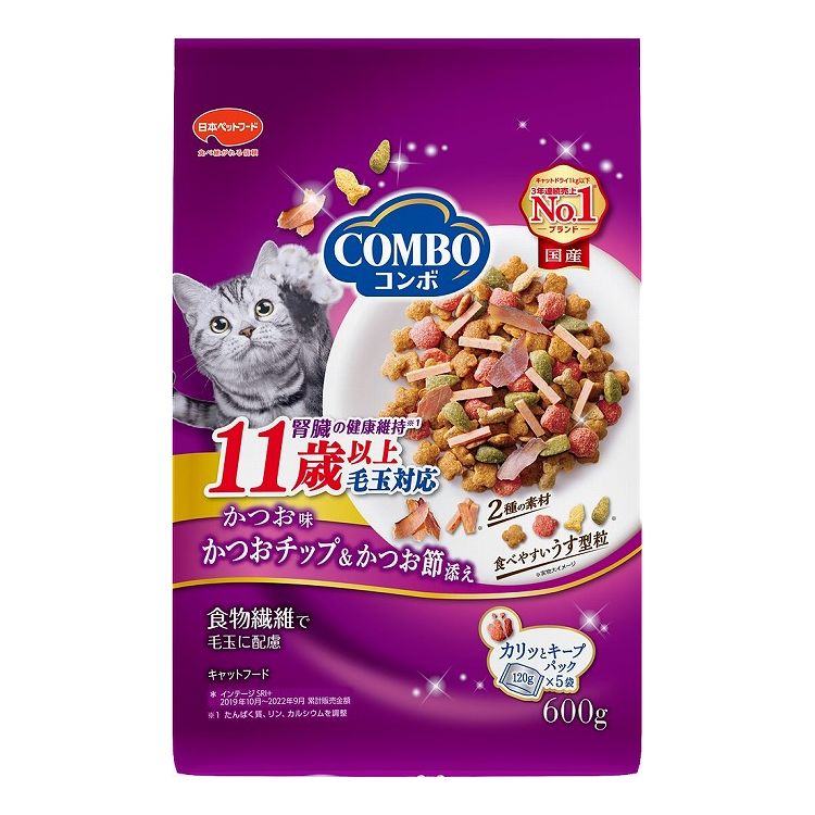 【4個セット】 日本ペットフード コンボ キャット 毛玉対応11歳以上 かつお味・かつおチップ・かつお節添え 600g (120g×5)【ポイント10倍】 【送料無料】