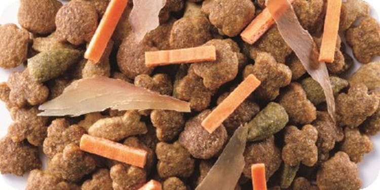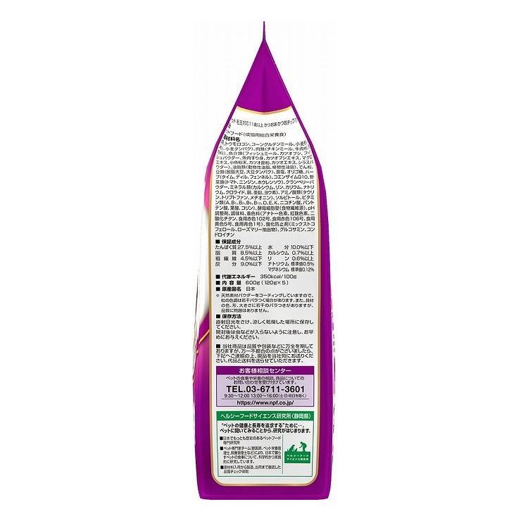 穀類(トウモロコシ、コーングルテンミール、小麦粉、パン粉、小麦タンパク)、肉類(チキンミール、牛肉粉、豚肉粉)、魚介類(フィッシュミール、カツオブシ、フィッシュパウダー、魚肉すり身、カツオブシエキス、マグロエキス、小魚粉末、カツオ節粉、カツオエキス、シラスパウダー)、油脂類(動物性油脂、植物性油脂)、でん粉、豆類(脱脂大豆、大豆タンパク)、食塩、オリゴ糖、ハーブ(タイム、ディル、フェンネル)、コエンザイムQ10、野菜類(トマト、ニンジン、ホウレンソウ)、クランベリーパウダー、ミネラル類(カルシウム、リン、カリウム、ナトリウム、クロライド、銅、亜鉛、ヨウ素)、アミノ酸類(タウリン、トリプトファン、メチオニン)、ソルビトール、ビタミン類(A、B1、B2、B6、B12、D、E、K、ニコチン酸、パントテン酸、葉酸、コリン)、酵母細胞壁(食物繊維源)、pH調整剤、調味料、着色料(アナトー色素、二酸化チタン、食用赤色102号、食用赤色106号、食用黄色5号、食用青色1号)、酸化防止剤(ミックストコフェロール、ローズマリー抽出物)、グルコサミン、コンドロイチン