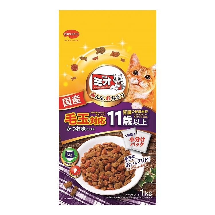 【8個セット】 日本ペットフード ミオドライミックス 毛玉対応 11歳以上かつお味 1kg【ポイント10倍】 【送料無料】