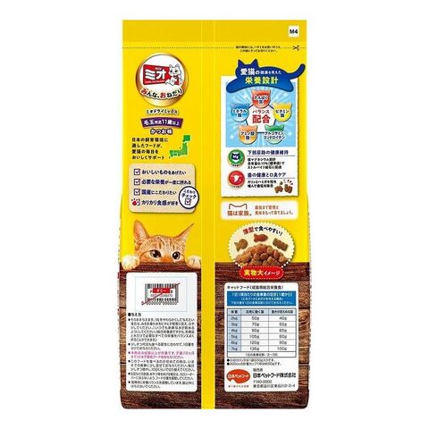 たんぱく質24.0%以上、脂質8.5%以上、粗繊維4.5%以下、灰分9.0%以下、水分10.0%以下、カルシウム0.6%以上、リン0.5%以上、リノール酸0.9%、マグネシウム標準値0.11%