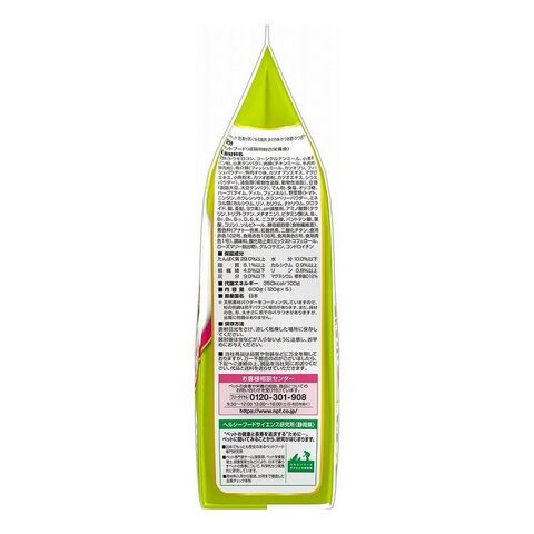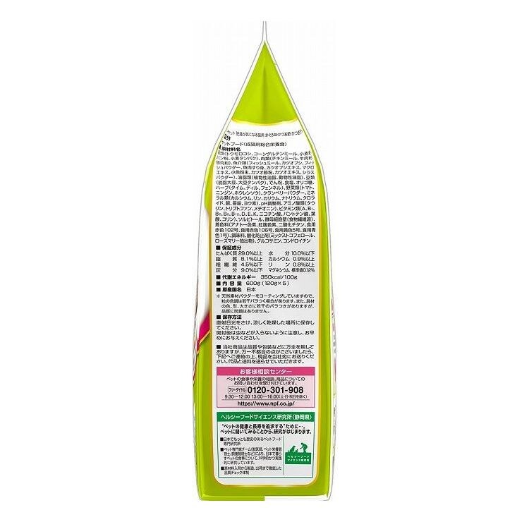 穀類(トウモロコシ、コーングルテンミール、小麦粉、パン粉、小麦タンパク)、肉類(チキンミール、牛肉粉、豚肉粉)、魚介類(フィッシュミール、カツオブシ、フィッシュパウダー、魚肉すり身、カツオブシエキス、マグロエキス、小魚粉末、カツオ節粉、カツオエキス、シラスパウダー)、油脂類(植物性油脂、動物性油脂)、豆類(脱脂大豆、大豆タンパク)、でん粉、食塩、オリゴ糖、ハーブ(タイム、ディル、フェンネル)、野菜類(トマト、ニンジン、ホウレンソウ)、クランベリーパウダー、ミネラル類(カルシウム、リン、カリウム、ナトリウム、クロライド、銅、亜鉛、ヨウ素)、pH調整剤、アミノ酸類(タウリン、トリプトファン、メチオニン)、ビタミン類(A、B1、B2、B6、B12、D、E、K、ニコチン酸、パントテン酸、葉酸、コリン)、ソルビトール、酵母細胞壁(食物繊維源)、着色料(アナトー色素、二酸化チタン、食用赤色102号、食用赤色106号、食用黄色5号、食用青色1号)、調味料、酸化防止剤(ミックストコフェロール、ローズマリー抽出物)、グルコサミン、コンドロイチン