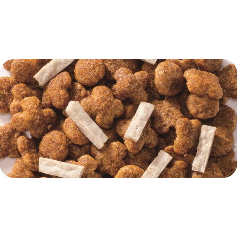 すくすく健康ブレンド!まぐろとかつお味にサクッと食感のにぼし入りチップを添えた子ねこ用。うす型小粒。