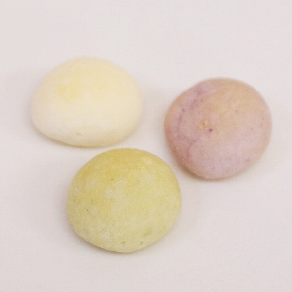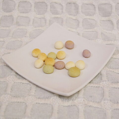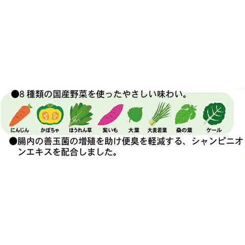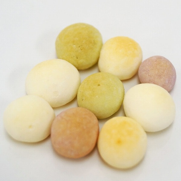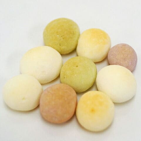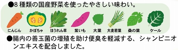 【原材料】馬鈴薯でん粉、水飴、砂糖、小麦粉、卵、オリゴ糖、液糖、脱脂粉乳、野菜類(大麦若葉、ケール、ほうれん草、かぼちゃ、にんじん、桑の葉、大葉)、シャンピニオンエキス、紫いも、ミネラル類(カルシウム)、膨張剤