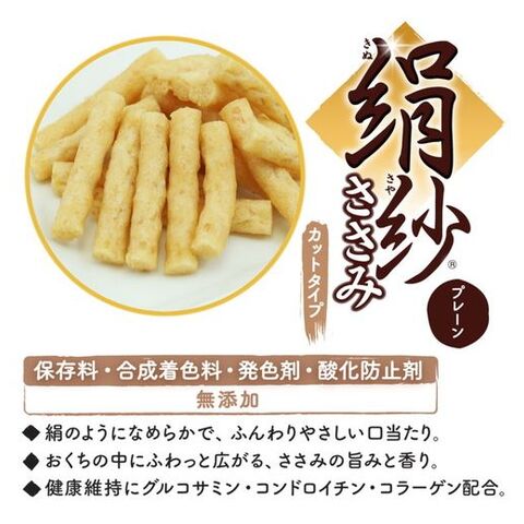 肉類(鶏ササミ、鶏胸肉、鶏肉)、小麦粉、糖類、タピオカでん粉、コラーゲンペプチド、魚軟骨抽出物(コンドロイチン含有)、グリセリン、トレハロース、膨張剤、ソルビトール、ミネラル類(ナトリウム)、ポリリン酸ナトリウム、着色料(クチナシ、ルテイン)、グルコサミン