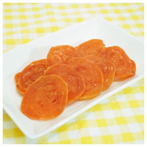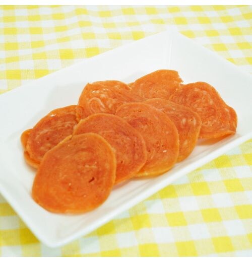 ・旨みが濃厚なビーフ生地にカルシウム・乳酸菌入りの生地をあわせ、サラミそっくりのおいしさ・香り・見た目にこだわりました。
