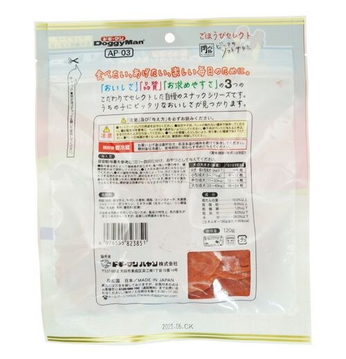 肉類(鶏肉、鶏ササミ、牛肉)、小麦粉、鶏脂、コーンスターチ、乳酸菌、ソルビトール、グリセリン、ミネラル類(カルシウム)、リン酸塩(Na)、乳化剤、香料、着色料(紅麹)