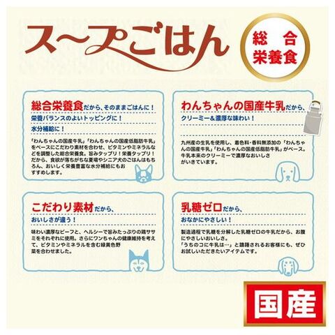 ・旨みタップリ!栄養タップリ!だから、食欲が落ちがちな夏場やシニア犬のごはんはもちろん、おいしく栄養豊富な水分補給にもおすすめします。