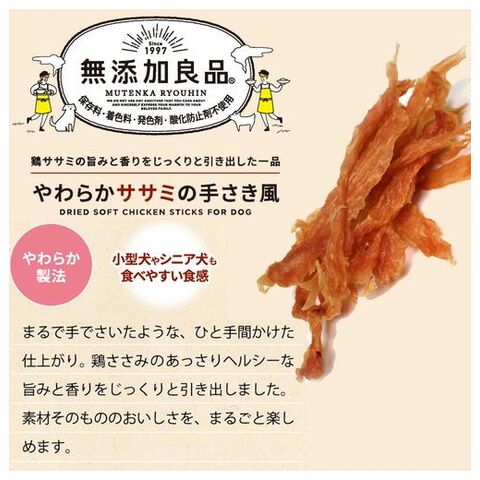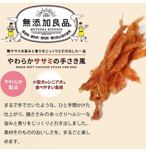 鶏肉の中で最も低脂肪でヘルシーなササミを、ひと手間かけた手巻き風に仕上げました。、しっとりやわらかなおいしさを味わえます。手でちぎれるほどの柔らかさなので、超小型犬、小型犬でも食べやすい大きさにすることができます。保存料、着色料、発色剤不使用。