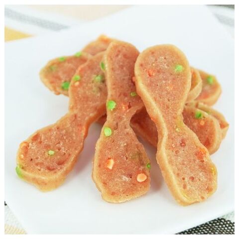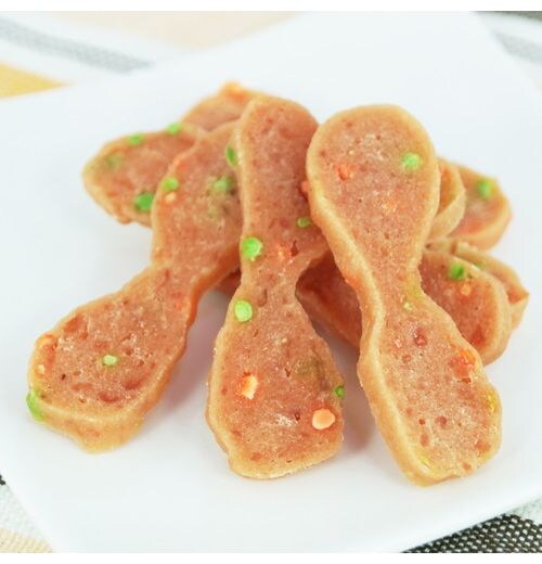 鶏肉(胸肉、ササミ)、小麦粉、にんじん、ほうれん草、ソルビトール、グリセリン、プロピレングリコール、ミネラル類(ナトリウム)、リン酸塩(Na)、発色剤(亜硝酸ナトリウム)、着色料(赤102、赤106、黄4、黄5、青1)
