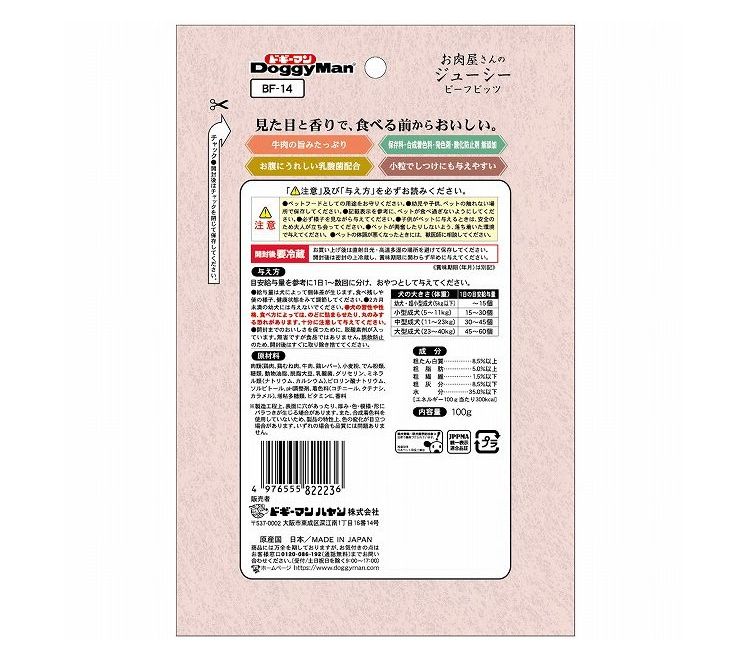 ・商品特性上、乾燥すると弾力を失い硬くなります。開封後は密閉の上冷蔵し、賞味期限に関わらず早めに与えてください。