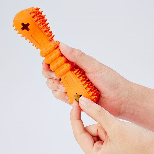 噛み心地抜群のラバー素材。おやつを挟んで遊んだり、ジェルを使えばデンタル効果もでます。
