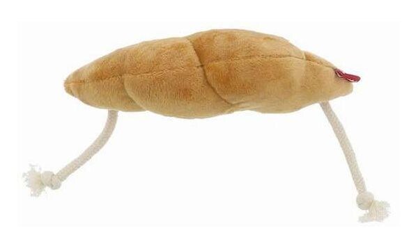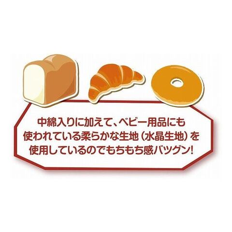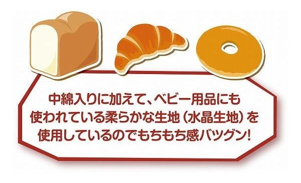 美味しそうなパンが、もちもちなぬいぐるみのおもちゃになりました。“水晶生地”という柔らかく肌触りの良い生地を使用しており、バツグンのもちもち感を生み出しています。笛が入っており、噛むたびにピューピュー音が鳴ります。ひも付きなので、引っ張り遊びも可能です。