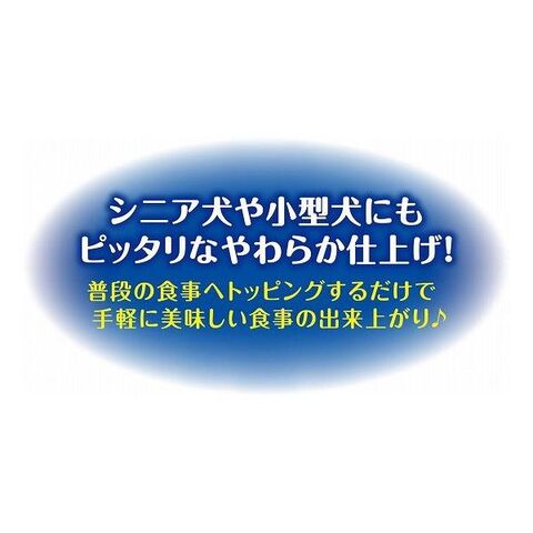 袋のままお湯につけて人肌程度に温めるとより美味しくなります。シニア犬や小型犬にもピッタリなやわらか仕上げ!普段の食事へトッピングするだけで、手軽に美味しい食事の出来上がり♪関節の健康維持にグルコサミン・コンドロイチン配合。