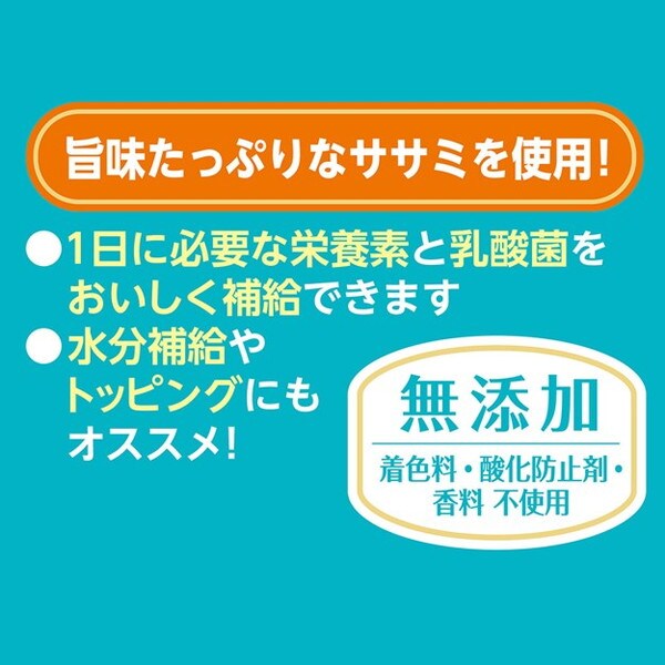 肉類(鶏・鶏レバー・鶏ササミ)、鶏脂、まぐろエキス、チキンエキス、食塩、小麦粉、殺菌乳酸菌(プラズマ乳酸菌)、酵母、オリゴ糖、増粘多糖類、ミネラル類(カルシウム・リン・亜鉛・鉄・銅・ヨウ素・マンガン・コバルト・ケイ素)、ビタミン類(A・B1・B2・B6・B12・C・D・E・ナイアシン・パントテン酸・コリン)、タウリン、メチオニン