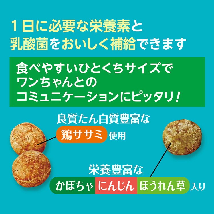 小麦粉、肉類(鶏ササミ・鶏・鶏レバー)、脱脂大豆、砂糖、でんぷん類、脱脂米ぬか、植物性油脂、コラーゲン、食塩、殺菌乳酸菌(プラズマ乳酸菌)、かぼちゃ、にんじん、ほうれん草、酵母、オリゴ糖、ミネラル類(カルシウム・亜鉛・鉄・ケイ素・銅・ヨウ素・マンガン・コバルト)、プロピレングリコール、ソルビトール、グリセリン、トレハロース、着色料(クチナシ・紅麹)、ビタミン類(A・B2・B12・D・E・コリン)、香料、メチオニン