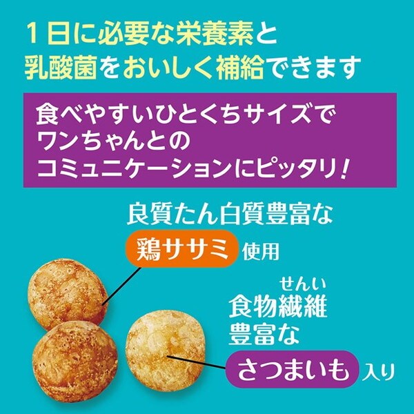 小麦粉、肉類(鶏ササミ・鶏・鶏レバー)、脱脂大豆、砂糖、でんぷん類、脱脂米ぬか、植物性油脂、さつまいも、コラーゲン、食塩、殺菌乳酸菌(プラズマ乳酸菌)、酵母、オリゴ糖、ミネラル類(カルシウム・亜鉛・鉄・銅・ヨウ素・マンガン・コバルト・ケイ素)、プロピレングリコール、ソルビトール、グリセリン、トレハロース、着色料(クチナシ・紅麹)、ビタミン類(A・B2・B12・D・E・コリン)、香料、酸化防止剤(V.E)、メチオニン