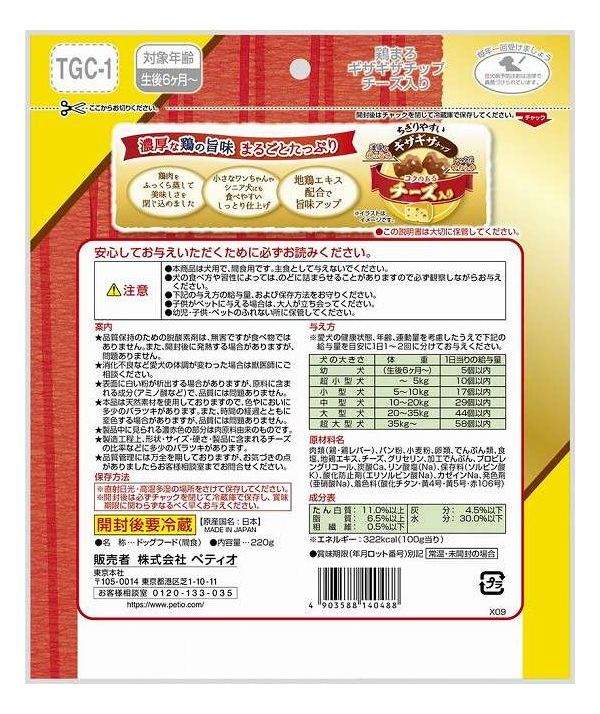濃厚な鶏の旨味まるごとたっぷり。鶏肉をふっくら蒸して美味しさを閉じ込めました。小さなワンちゃんやシニア犬にも食べやすいしっとり仕上げ。ちぎりやすいギザギザチップ形状。コクのあるチーズ入り。