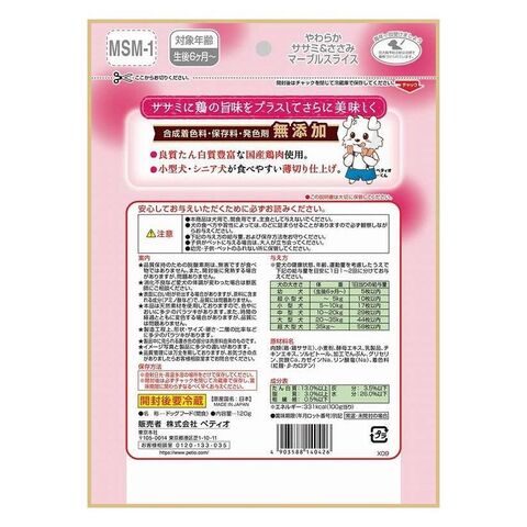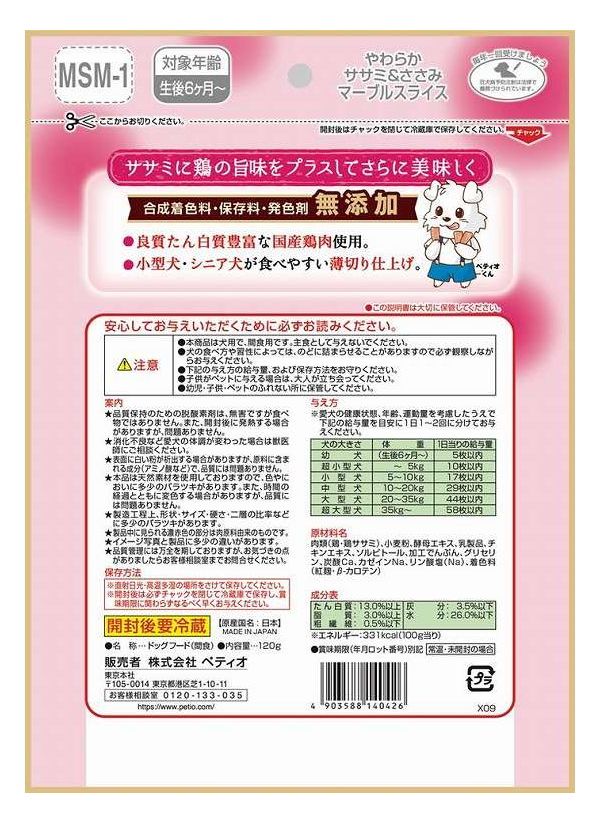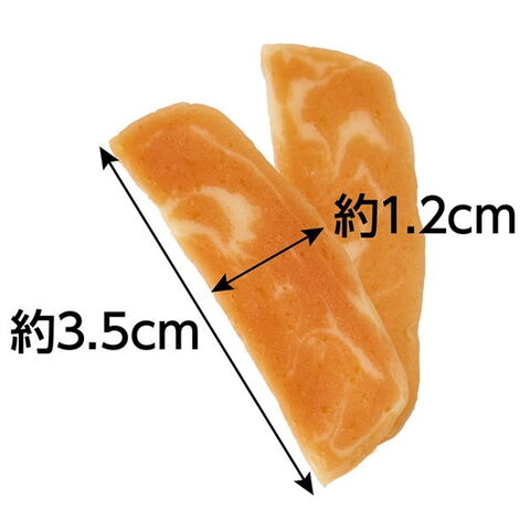 肉類(鶏・鶏ササミ)、小麦粉、酵母エキス、乳製品、チキンエキス、ソルビトール、加工でんぷん、グリセリン、炭酸Ca、カゼインNa、リン酸塩(Na)、着色料(紅麹・β-カロテン)
