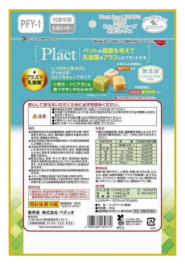 Plactはペットの健康を考えて乳酸菌をプラスしたブランドです。小型犬・シニア犬にも食べやすいやわらかさでしつけのごほうびにもピッタリのひとくちキューブタイプ。栄養豊富なにんじん・ほうれん草入り。合成着色料・発色剤無添加。