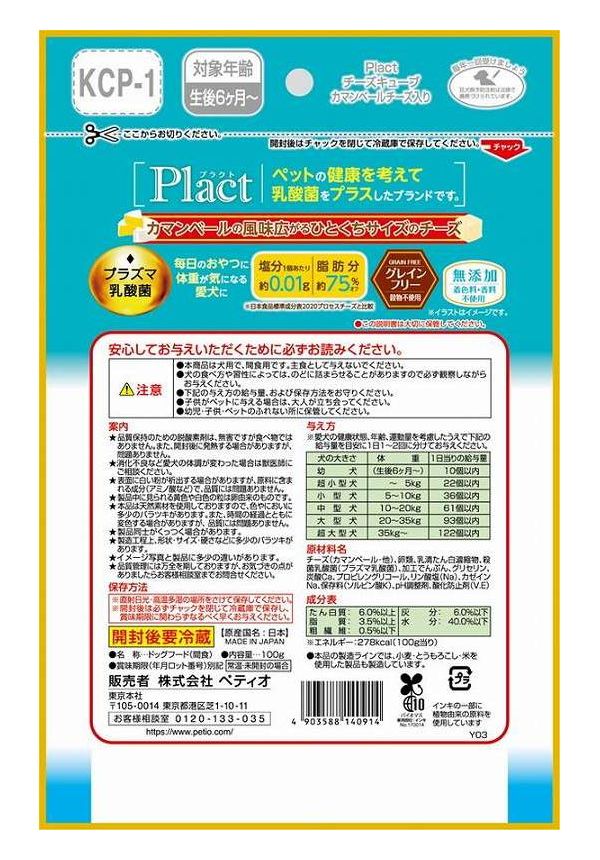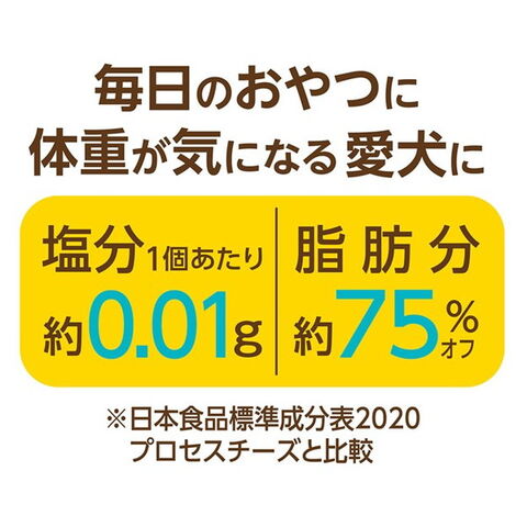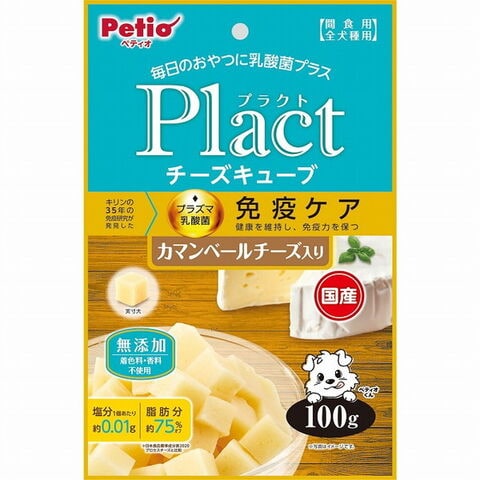Plactはペットの健康を考えて乳酸菌をプラスしたブランドです。塩分1個当たり約0.01gで脂肪分約75%オフ(日本食品標準表2020「プロセスチーズ」と比較)だから、毎日のおやつや体重が気になる愛犬におすすめ!カマンベールの風味広がるひとくちサイズのチーズ。穀物不使用のグレインフリー。着色料・香料無添加。