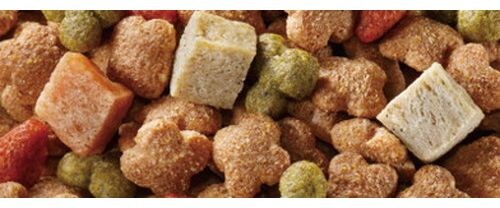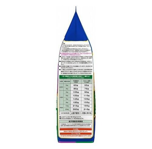 穀類(トウモロコシ、小麦粉、脱脂米糠、コーングルテンフィード、小麦タンパク)、肉類(チキンミール、チキン、鶏ササミ、牛肉粉、豚肉粉、チキンレバーパウダー)、脱脂大豆、油脂類(動物性油脂、植物性油脂(オメガ-6脂肪酸含む))、小魚粉末、糖類(ショ糖、オリゴ糖)、ビール酵母、食塩、セレン酵母、野菜類(キャベツ、大麦若葉、カボチャ、トマト、ニンジン、ブロッコリー、ホウレンソウ、モロヘイヤ)、コエンザイムQ10、カゼインホスホペプチド、プロピレングリコール、ミネラル類(カルシウム、リン、ナトリウム、クロライド、鉄、銅、マンガン、亜鉛、ヨウ素、コバルト)、pH調整剤、保存料(ソルビン酸カリウム、デヒドロ酢酸ナトリウム)、膨張剤、ソルビトール、ビタミン類(A、B2、B6、B12、D、E、パントテン酸、コリン)、着色料(二酸化チタン、食用赤色102号、食用赤色106号、食用黄色4号、食用黄色5号、食用青色1号)、グルコサミン、アミノ酸類(アルギニン、メチオニン)、コンドロイチン