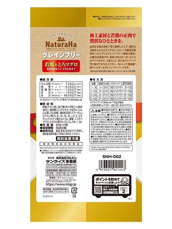 マルカンサンライズ ナチュラハ グレインフリー Premium 若鶏&とろマグロ 緑黄色野菜入り・とろみ仕立て 4個 犬 犬用 フード ドッグフード おやつ ペット ペットフード