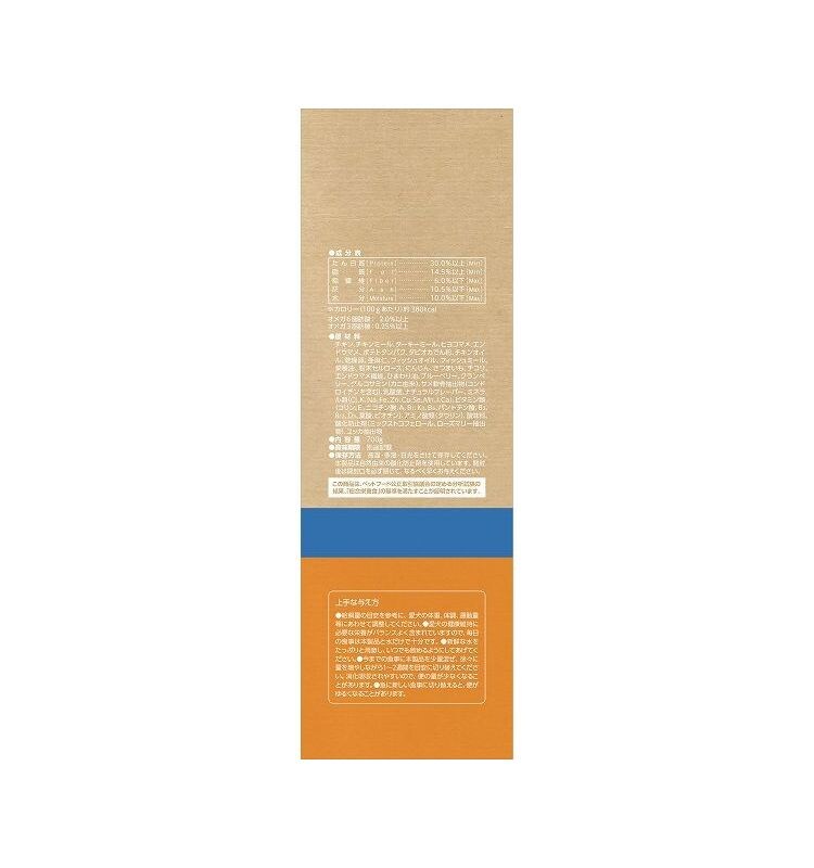 チキン、チキンミール、ターキーミール、ヒヨコマメ、エンドウマメ、ポテトタンパク、タピオカでん粉、チキンオイル、乾燥卵、亜麻仁、フィッシュオイル、フィッシュミール、菜種油、粉末セルロース、にんじん、さつまいも、チコリ、エンドウマメ繊維、ひまわり油、ブルーベリー、クランベリー、グルコサミン(カニ由来)、サメ軟骨抽出物(コンドロイチンを含む)、乳酸菌、ナチュラルフレーバー、ミネラル類(Cl、K、Na、Fe、Zn、Cu、Se、Mn、I、Ca)、ビタミン類(コリン、E、ニコチン酸、A、B1、K3、B6、パントテン酸、B2、B12、D3、葉酸、ビオチン)、アミノ酸類(タウリン)、酸味料(ミックストコフェロール、ローズマリー抽出物)、ユッカ抽出物