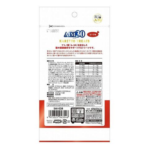 アミノ酸『A-30』を配合した猫の健康維持をサポートするトリーツです。手から一粒ずつ与えやすいカリッとした食感のクリスピータイプ。素材の風味を逃さない食べきり小分けパックなので、いつでも開けたての香りが広がります。おいしく食べて健やかな毎日をサポートします。