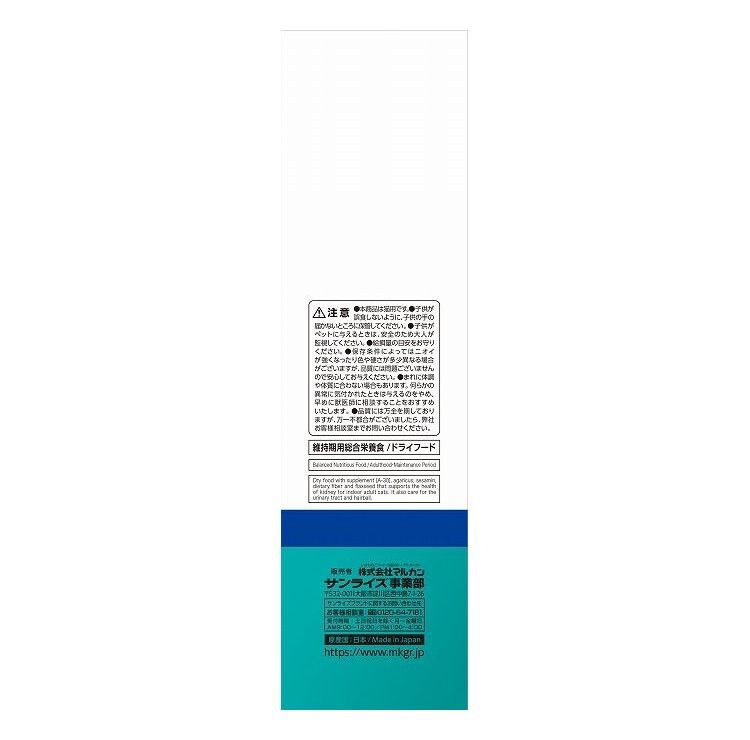 室内で過ごす成猫の下部尿路の健康維持のためマグネシウム、リン、カルシウムを調整し※、食物繊維の配合により体内の毛玉を無理なく排泄します。食物アレルギーに配慮してアレルゲンになりにくいといわれるフィッシュを使用し、健康を維持する事で免疫をサポートするアガリクスや抗酸化成分があるセサミンを配合しています。(※マグネシウム約0.1%、リン約1.0%、カルシウム約1.1%) 腎臓の健康維持に配慮し、ナトリウムの含有量を調整(標準0.37%)