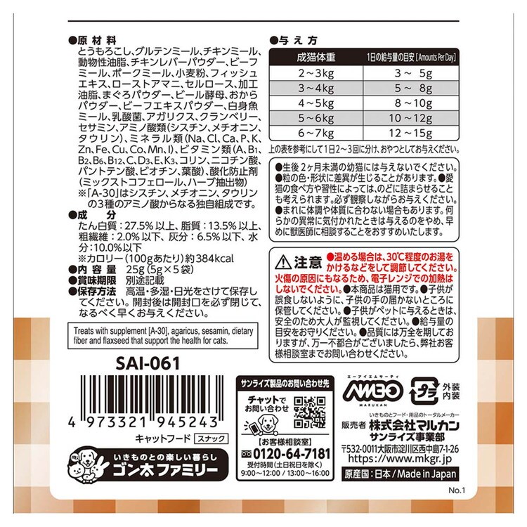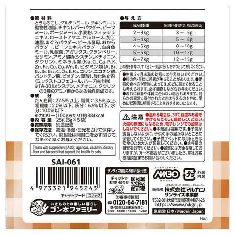 ・アミノ酸『A-30』を配合した猫の健康維持をサポートするトリーツです。