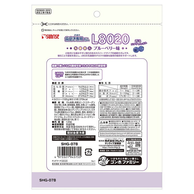 マルカン サンライズ ゴン太の歯磨き専用ガムSSサイズ L8020乳酸菌入り ブルーベリー味 120g【ポイント10倍】